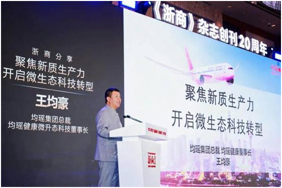 均瑶集团总裁、均瑶健康微升态科技董事长王均豪以《聚焦新质生产力,开启微生态科技转型》为题,分享了均瑶新质生产力的探索与实践经验成果。